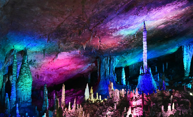 張家界武陵源的黃龍洞,號(hào)稱世界溶洞奇觀,今年九月份,我懷著探秘的心境前來(lái)欣賞。洞內(nèi),頭一段路較為平坦,約百米,漸漸踏上了石階,燈光灰暗,眼前的一切都顯得模糊,導(dǎo)游小邱說(shuō)洞中有幾層,展現(xiàn)在眼前的是一個(gè)豪華的“歌舞廳”,我想那龍王和他的子孫們?cè)谥匾墓?jié)日定然在這舞廳展示風(fēng)采吧!殿堂里燈光不停的閃爍,色彩斑闌,隱隱約約看見(jiàn)它的小女兒正在與情人約會(huì),手牽手低低切切,情意綿綿……這個(gè)大廳名曰:“龍舞廳”,之外,還有天堂宮、天仙宮、后宮、龍宮……